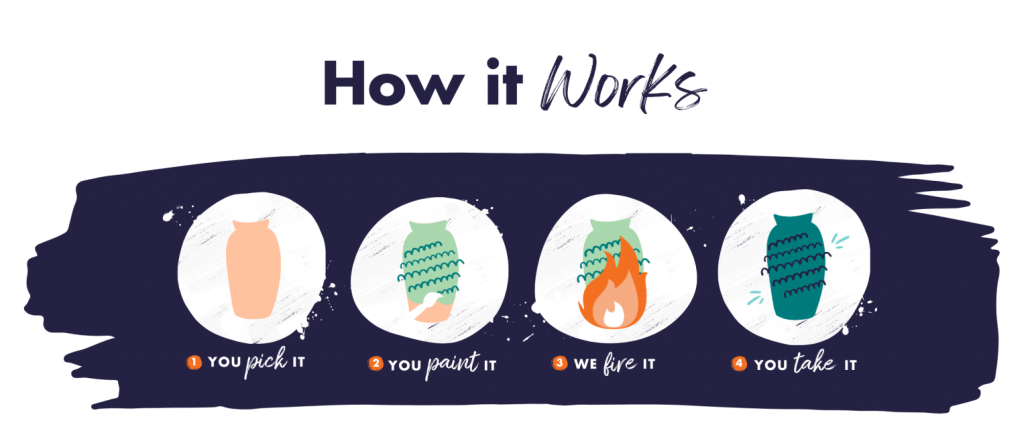 You pick it, you paint it. After you paint it, your item(s) need to be left with us for glazing & firing. Your artwork will be ready for pick up within 7-10 days.