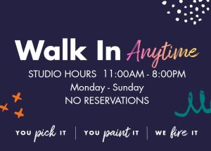 Walk-in and paint anytime our studio is open (as seating permits). On your way? Feel free to call us to check seating availability. If we happen to be full when you call, join our waitlist and we will call you when your table is ready. Occasionally we are closed for private events.