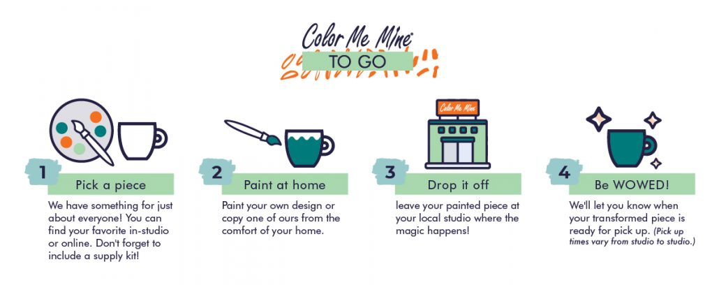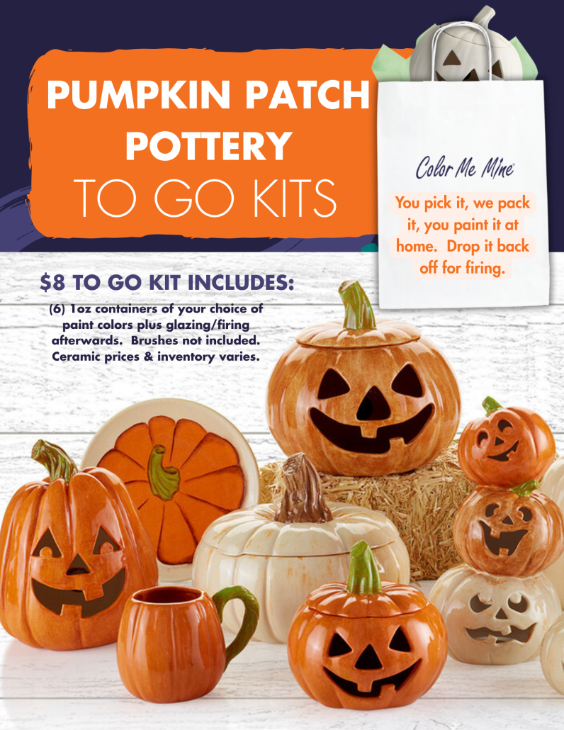 Our TO GO KITS ($8 per ceramic item purchased) include 6 containers of paint (your choice of colors) and instructions, plus glazing & firing afterwards. (Brushes are not included). This is ideal for those who want to paint at home. Ceramic prices vary and inventory changes daily. Stop by today to select your pieces and paint colors.